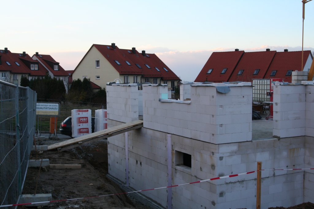 Blick von Nordwesten auf das Garagentor. Darüber erkennt man schon die beiden Fenster der Küche.