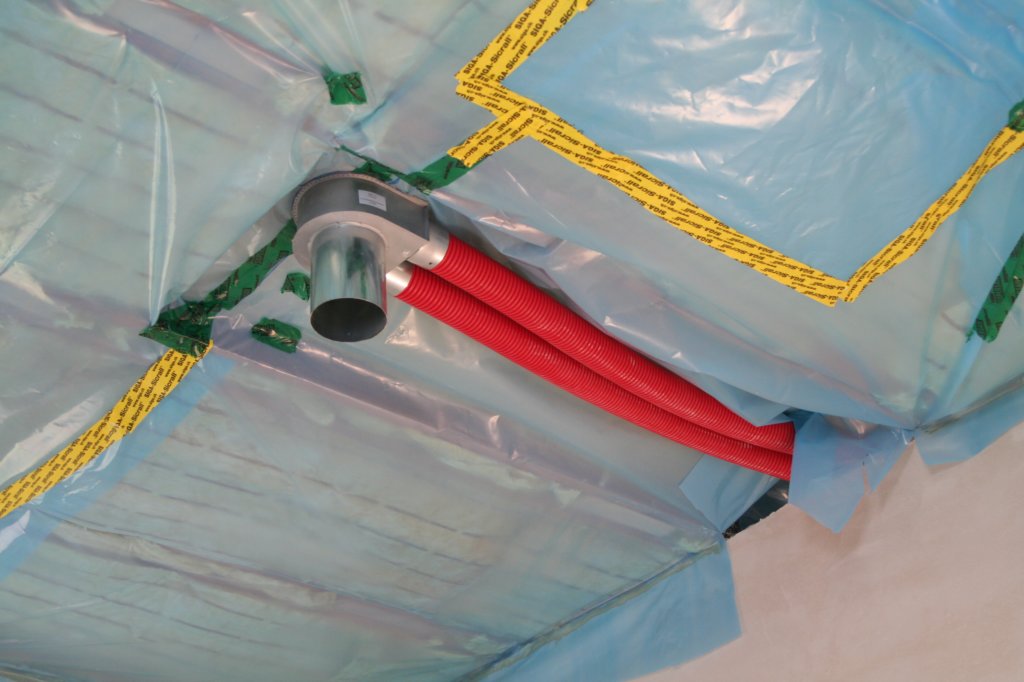 Über zwei Wanddurchführungen für Zu- und Abluft wird der Verteiler mit dem Heizungskeller verbunden.