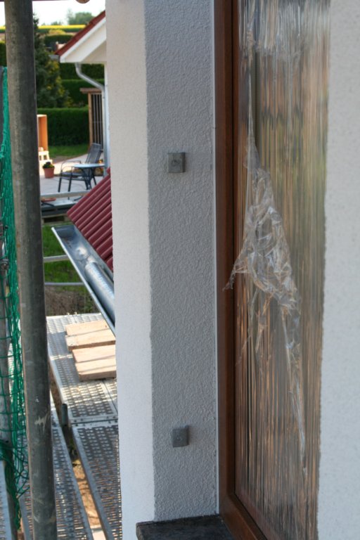 Nur die Nordwand der Garage und die Ostseite neben dem Erker sind noch nicht mit Oberputz versehen.