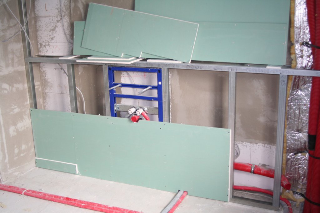 Im Dachgeschoss werden erste Metallschienen befestigt, an denen später die Gipskartonplatten festgeschraubt werden.